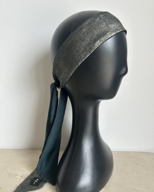 Matière : satin de soie à motifs géométriques, doublure satin vert